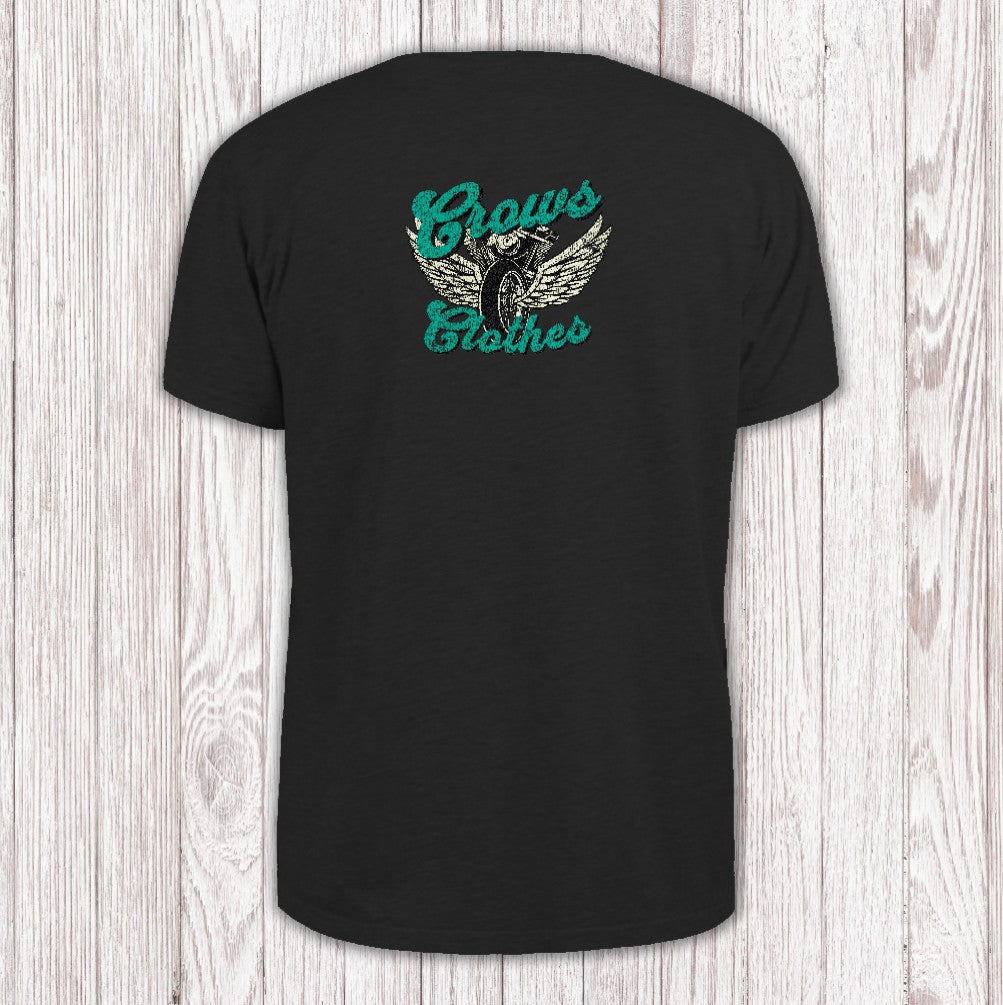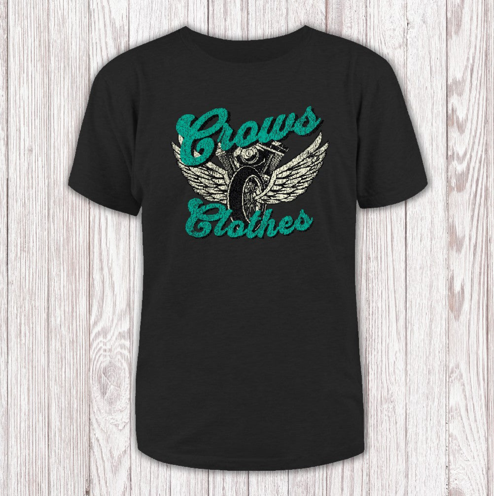 "Crows Clothes" pops in bold turquoise script, textured to look embroidered. Between the words, a winged motorcycle wheel adds a flash of retro, biker-inspired energy.