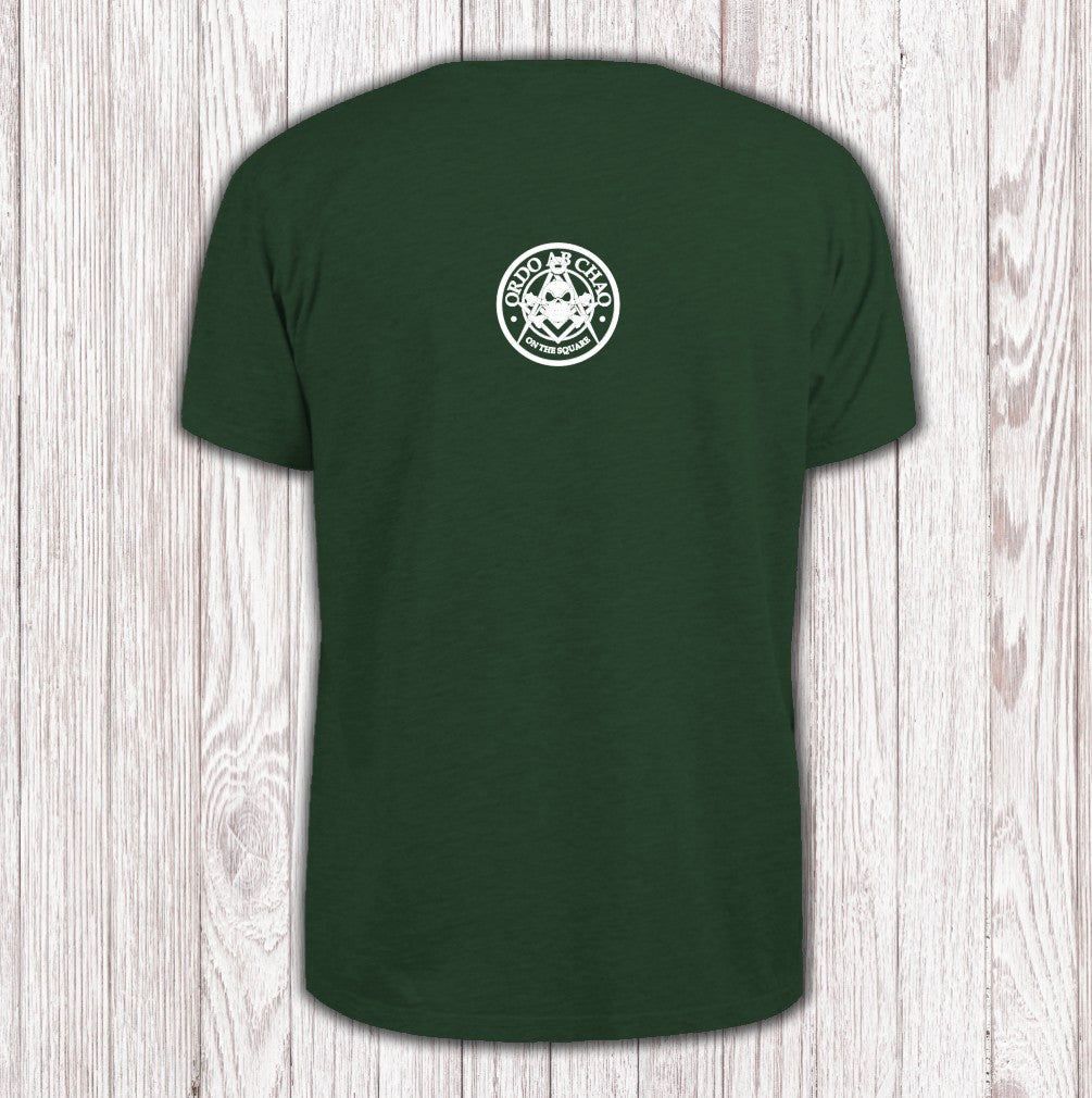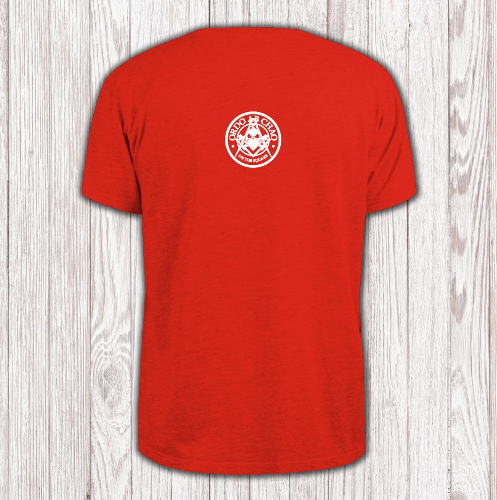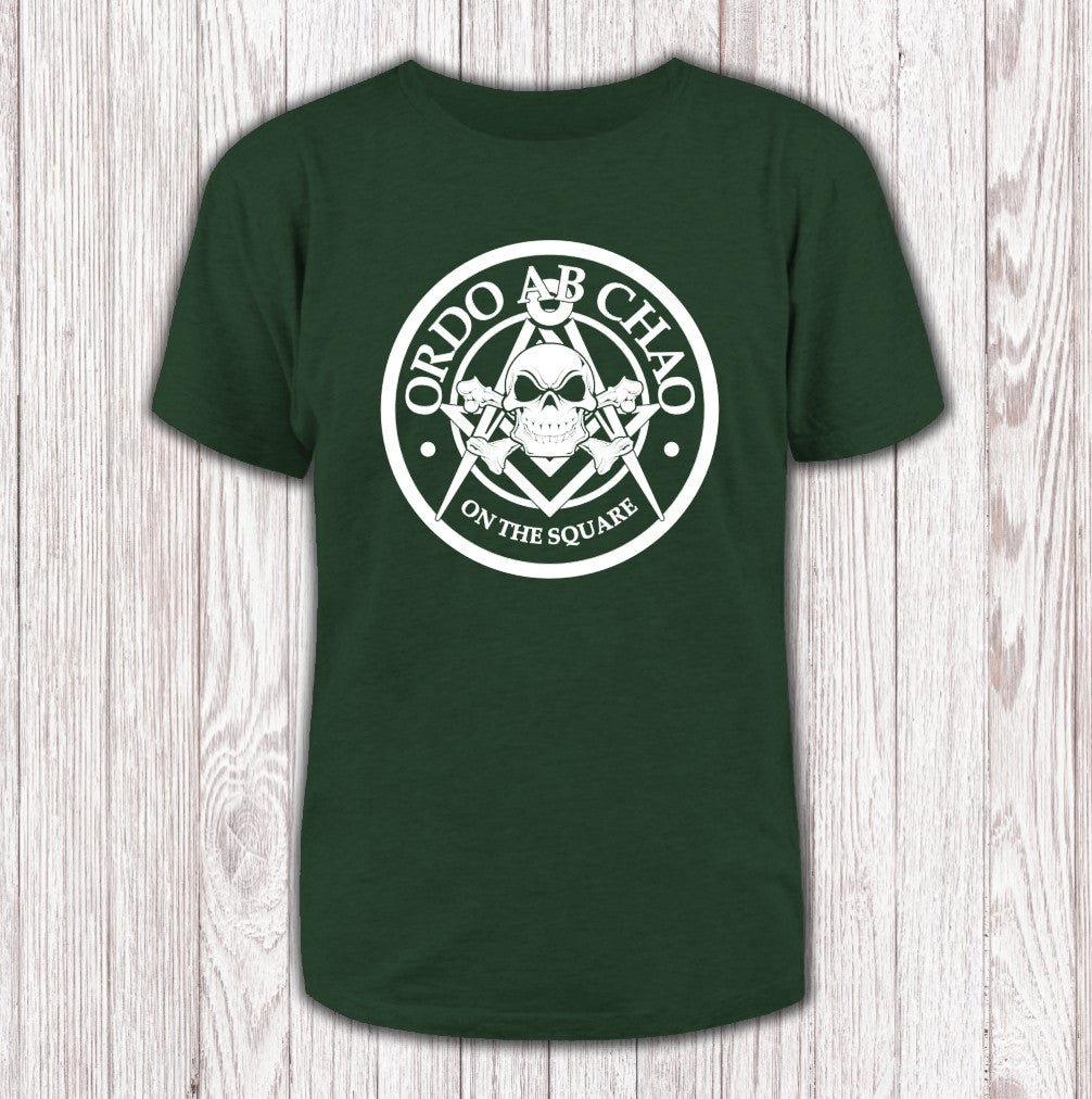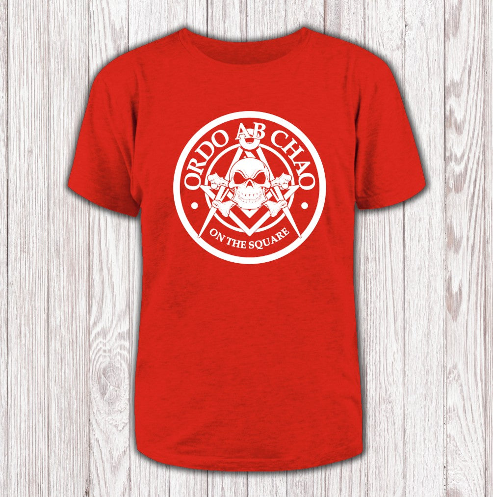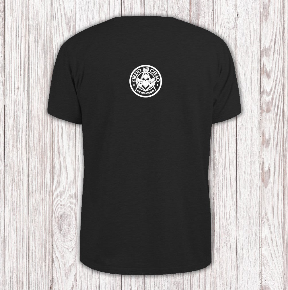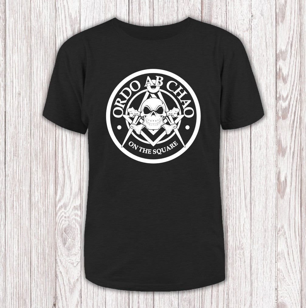 The "Ordo ab Chao" T-shirt stands out with an eye-catching mix of Masonic symbols, a skull and crossbones, the iconic square and compass, and the Latin motto "Order out of Chaos." This design weaves together intrigue and tradition, making it a bold statement for anyone drawn to the mysteries of Masonry.