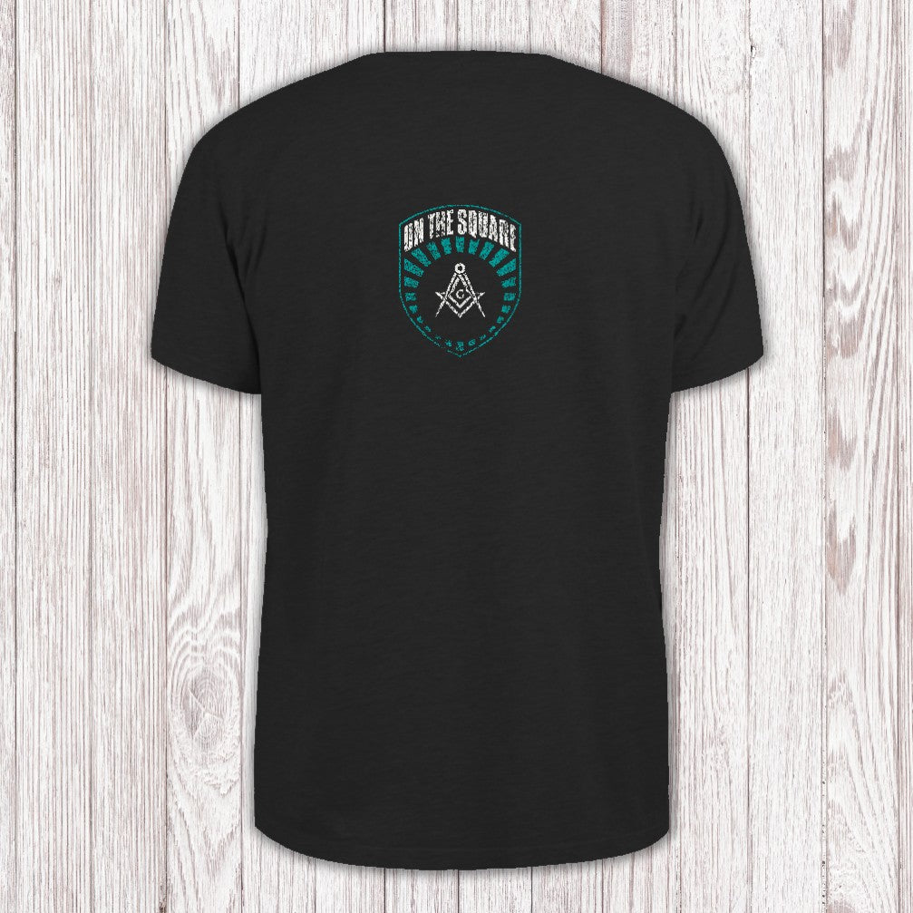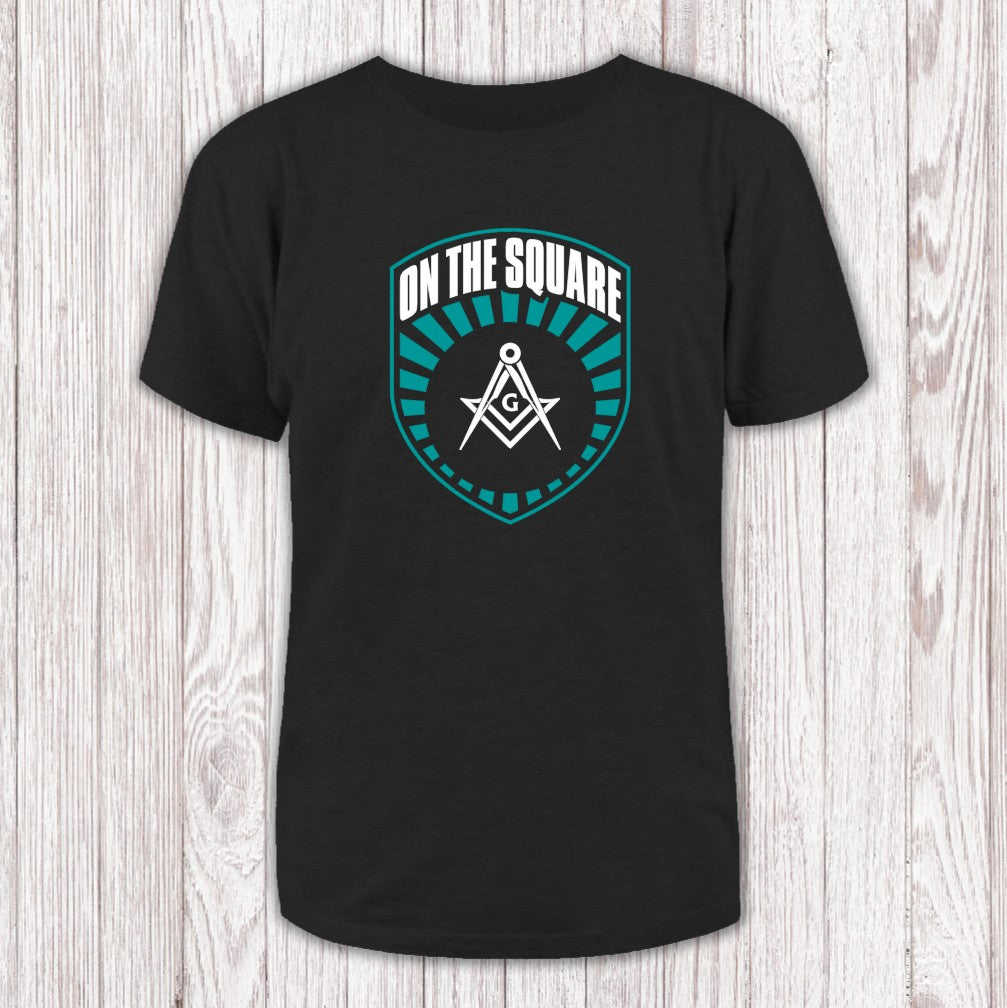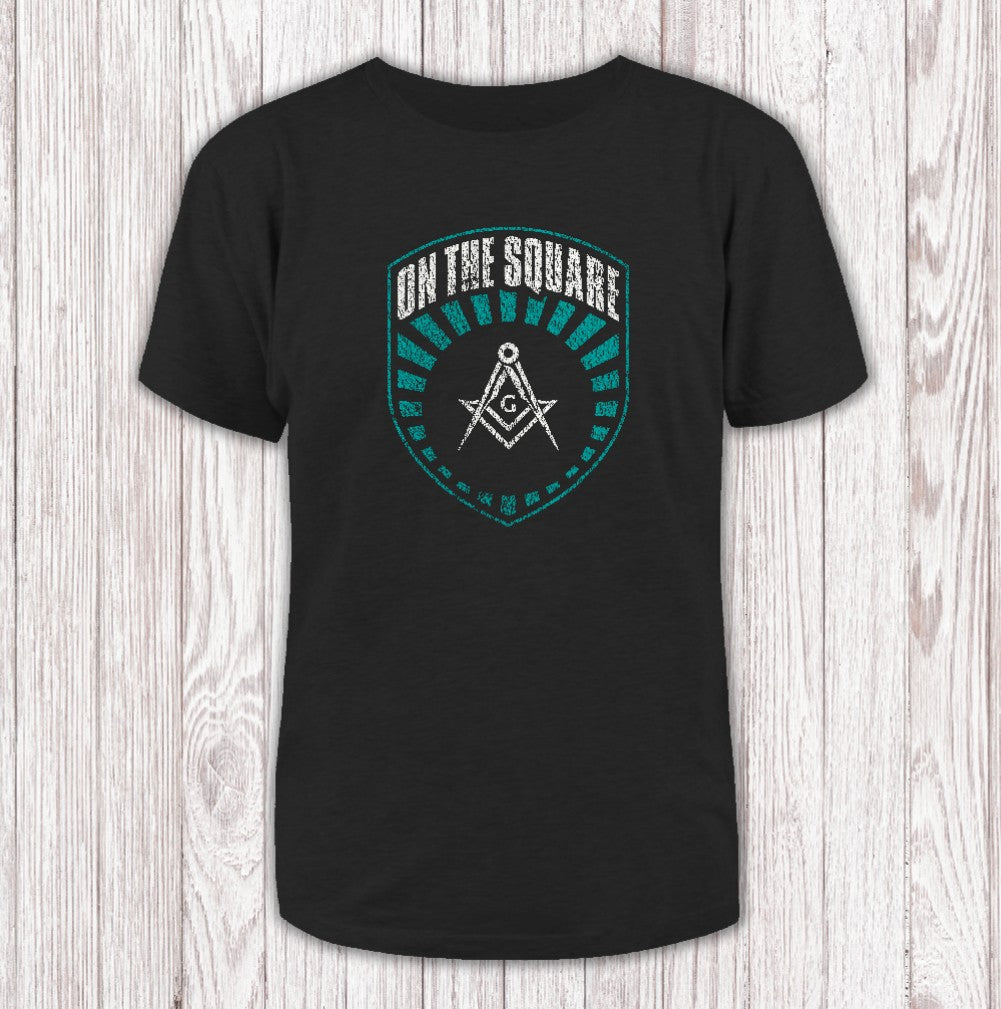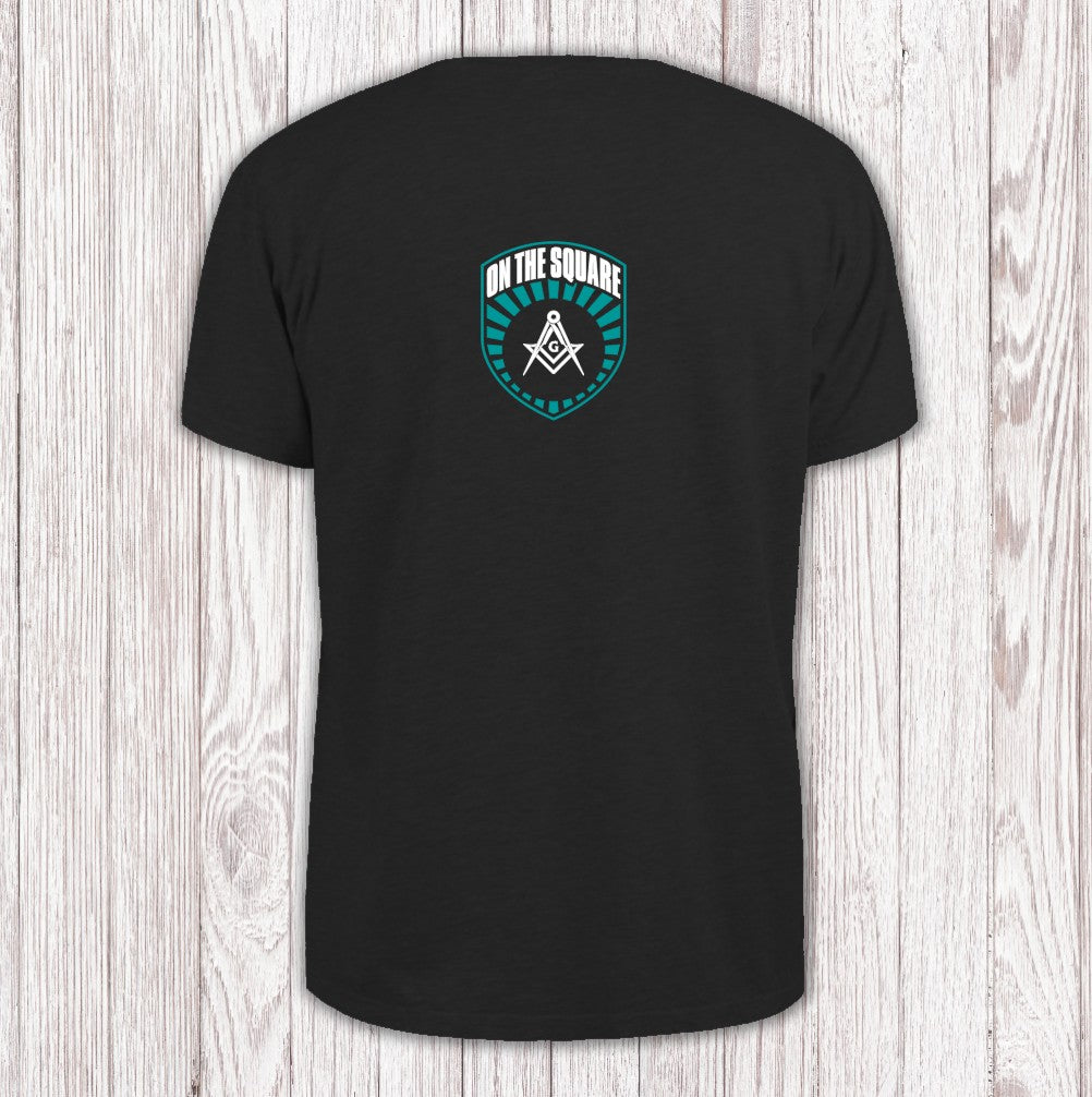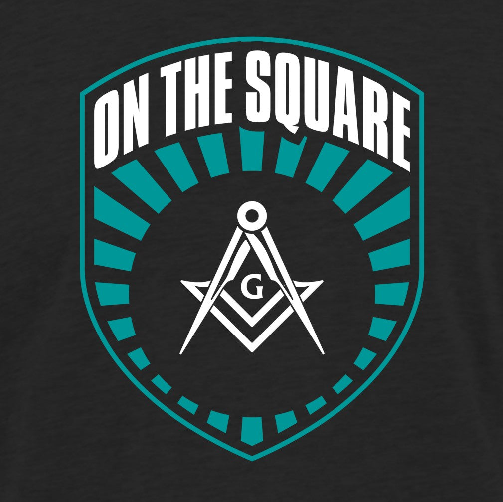 This T-shirt showcases a bold shield marked with the words "ON THE SQUARE." At its heart sits the classic white compass and square—an iconic emblem of Freemasonry—framed by teal lines that seem to pulse outward. The deep, dark background makes every detail and word stand out, giving the whole design a striking sense of depth and meaning.