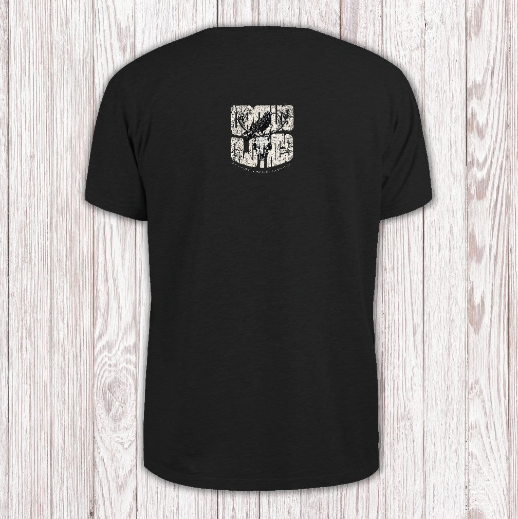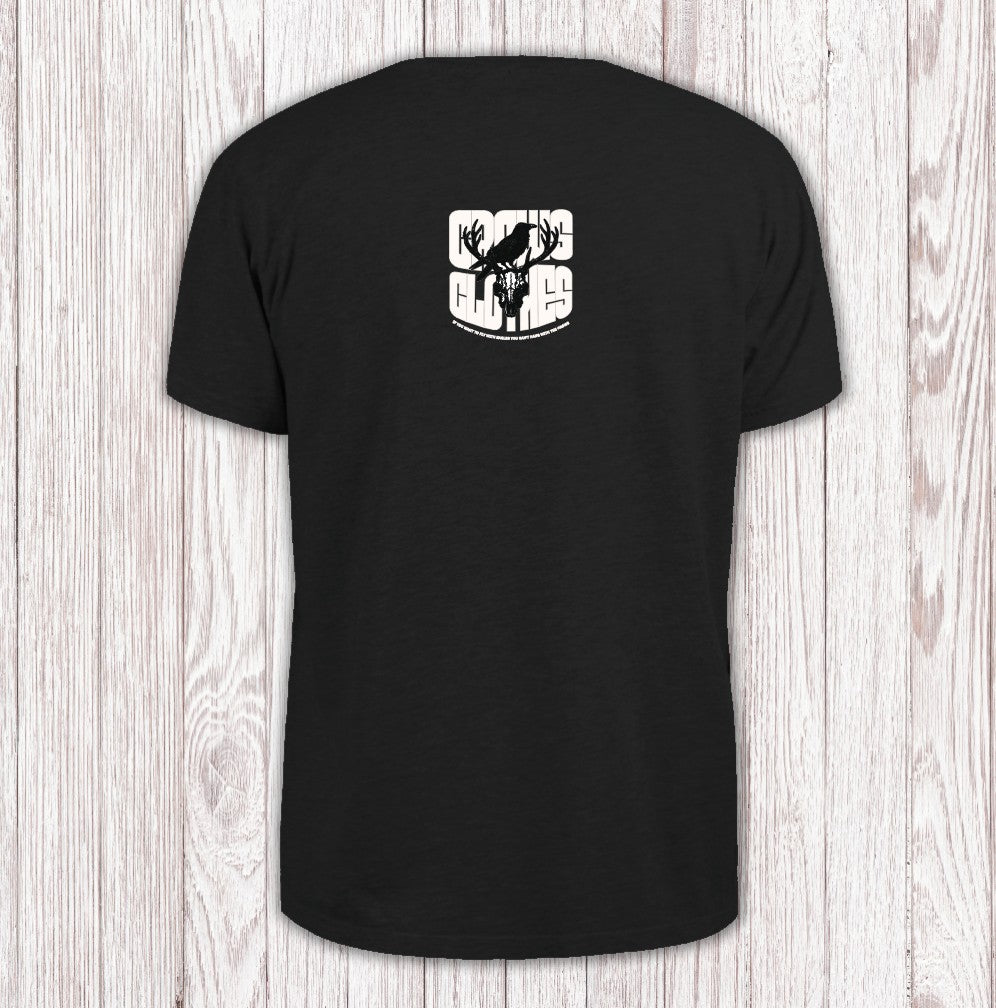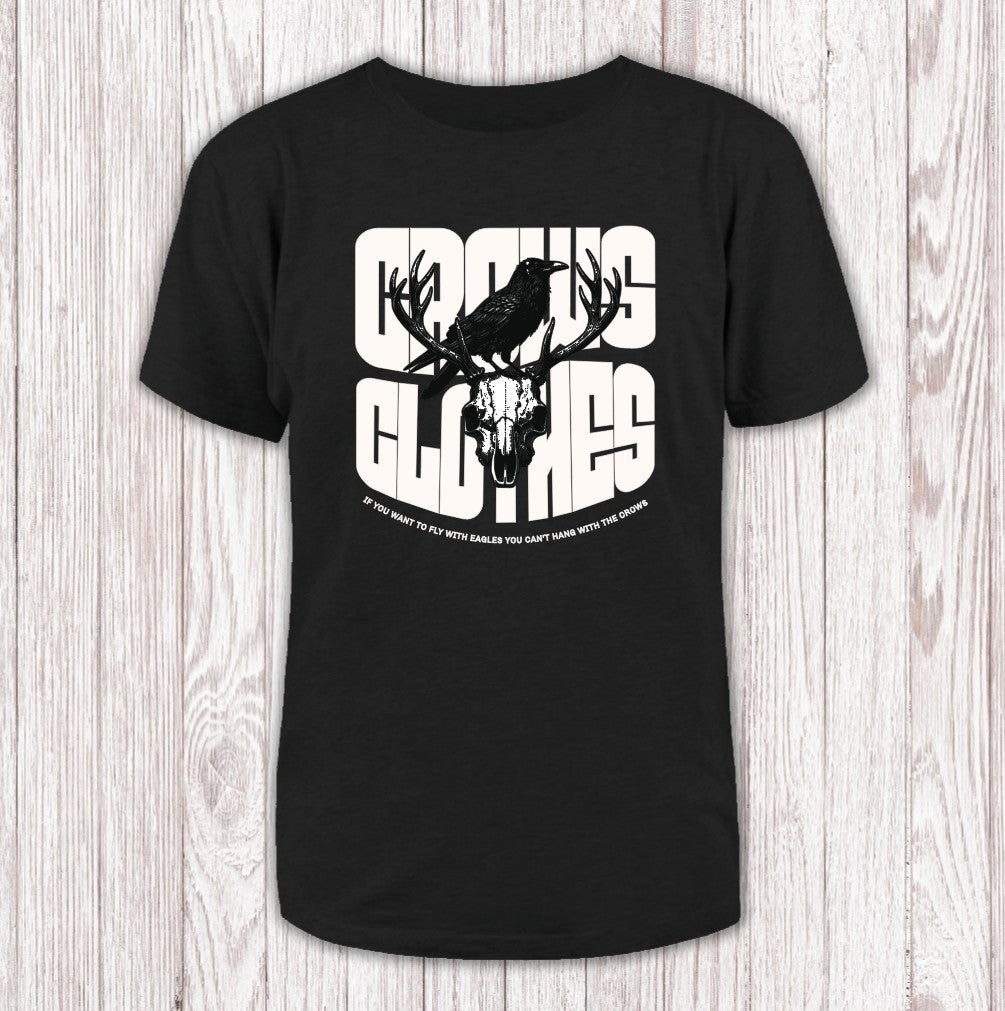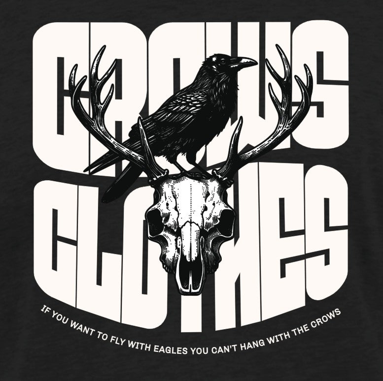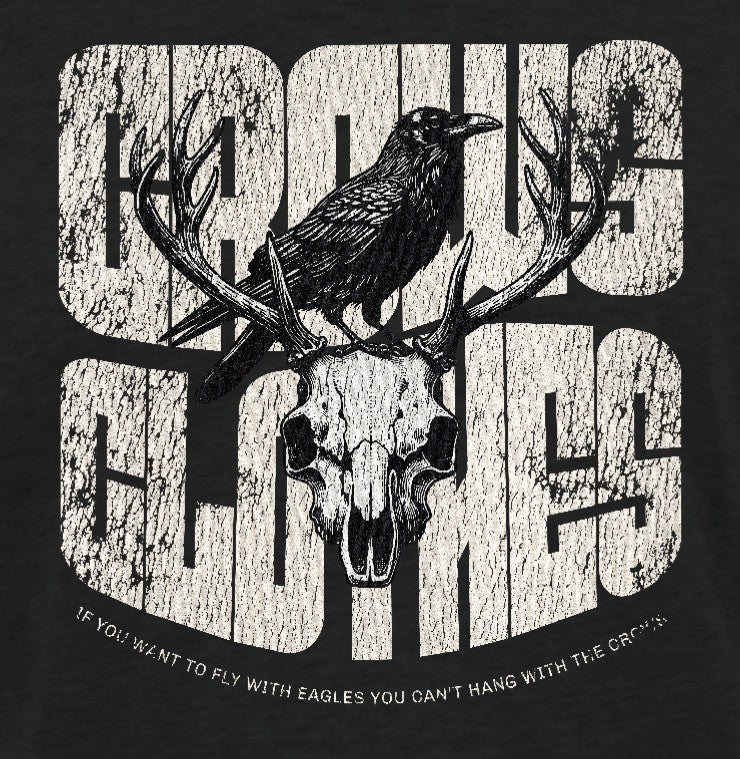 This T-shirt showcases a bold artwork, all sharp angles and attitude, a Crow perched atop an intricately rendered stag skull. The design pulls you in with its moody, gothic vibe, a blend of wild nature and something a little darker. Just below, a thought-provoking quote sits in smaller print, tying the whole piece together with a sense of mystery.