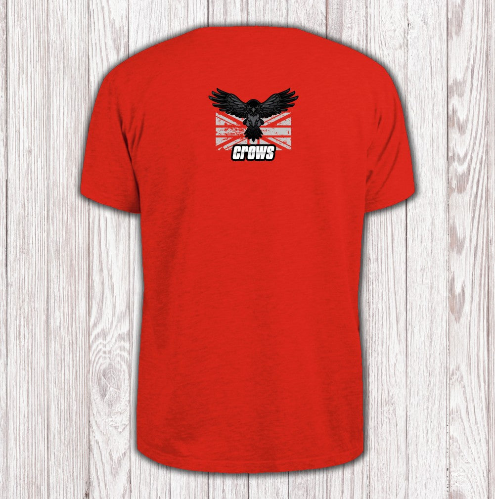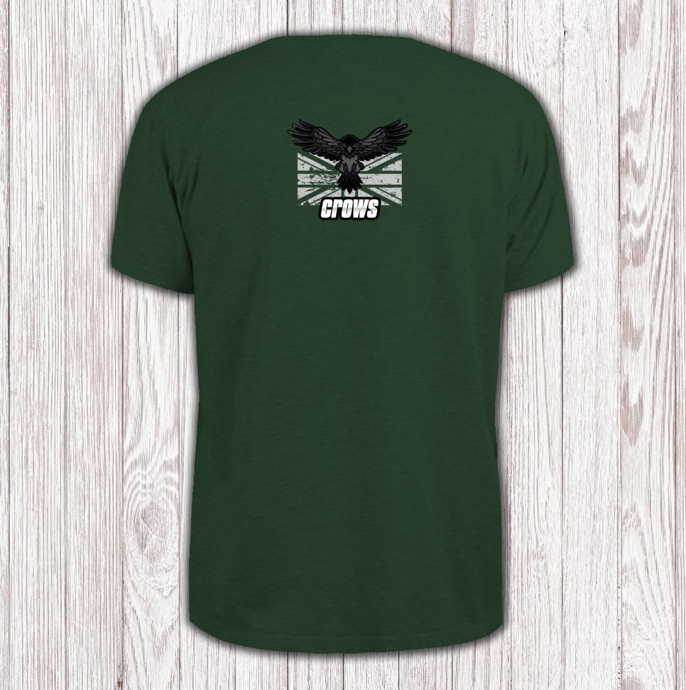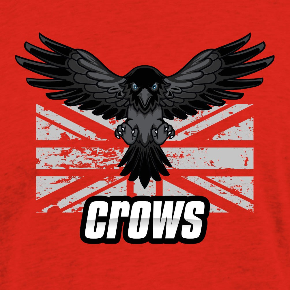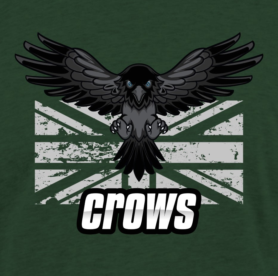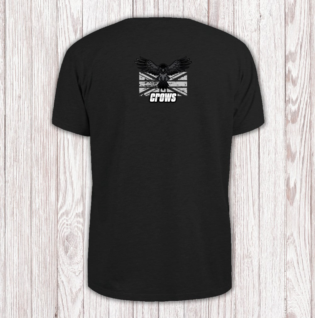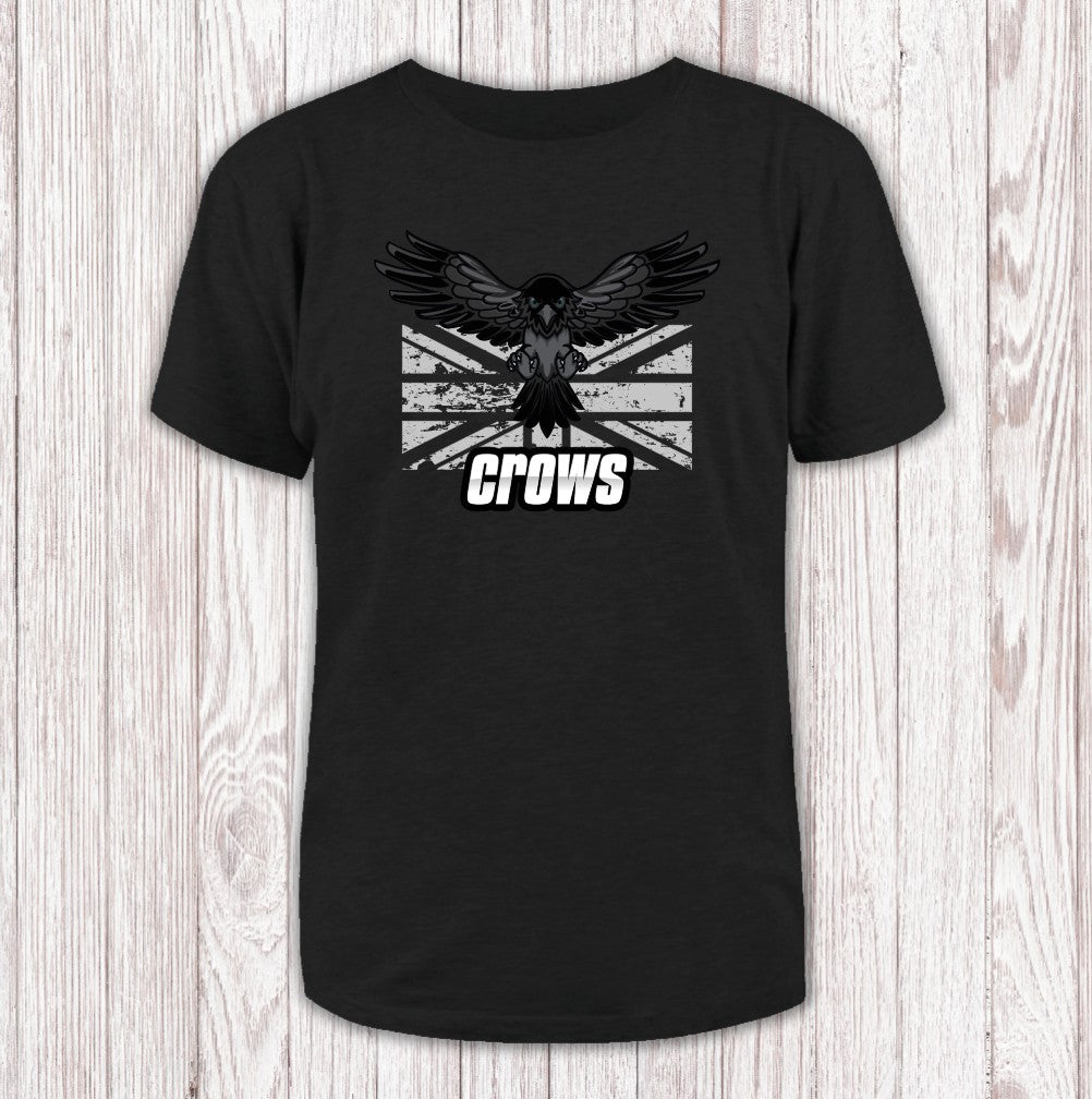A striking black crow soars across the front of this T-shirt, its wings outstretched in a display of power and freedom. The bird’s dark silhouette stands out against a faded, rugged Union flag, giving the whole design a gritty, rebellious edge. Just below, the Crow Clothes logo catches the eye, standing bold and bright against the worn texture of the flag, tying the design together with a touch of attitude.