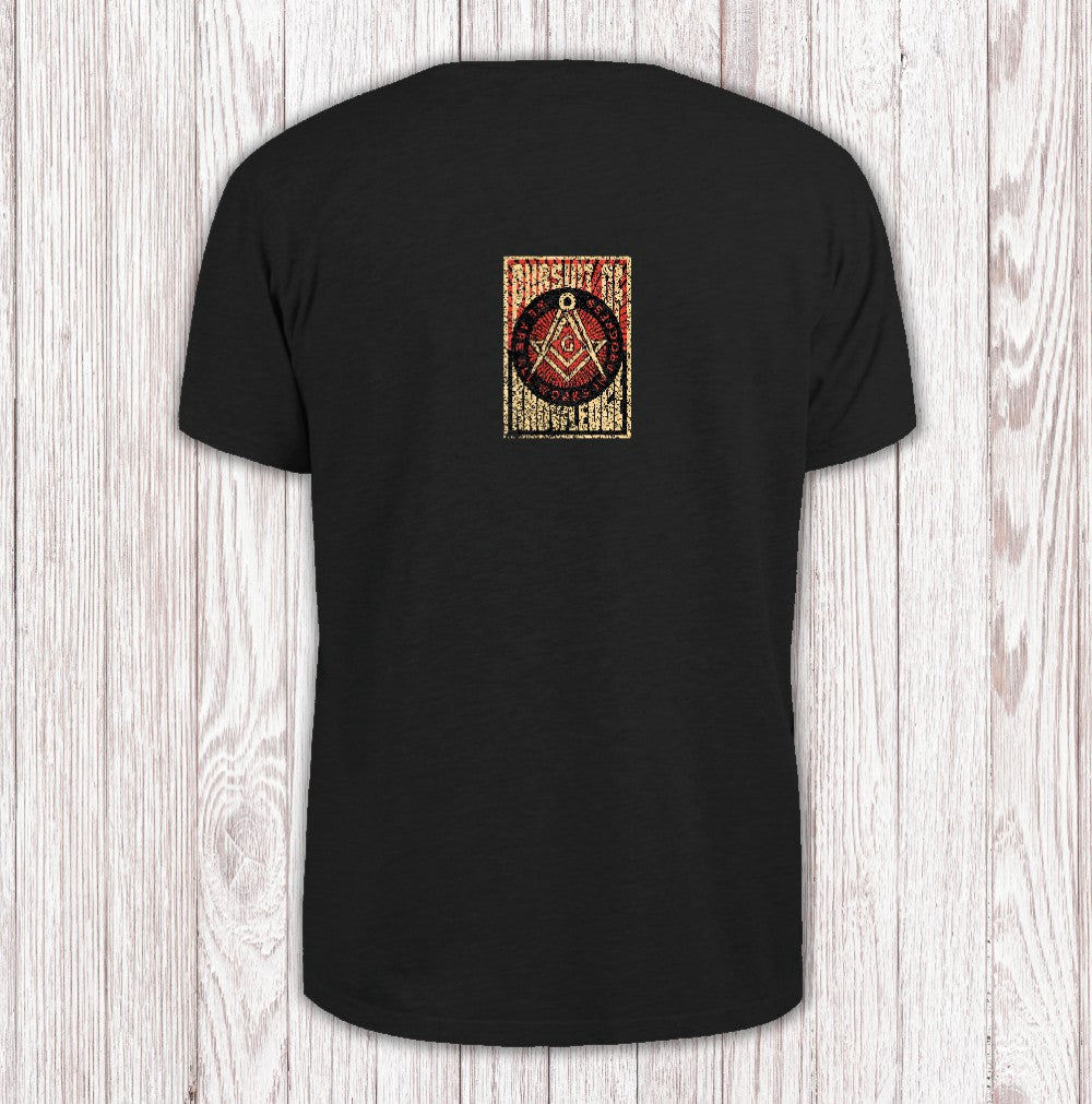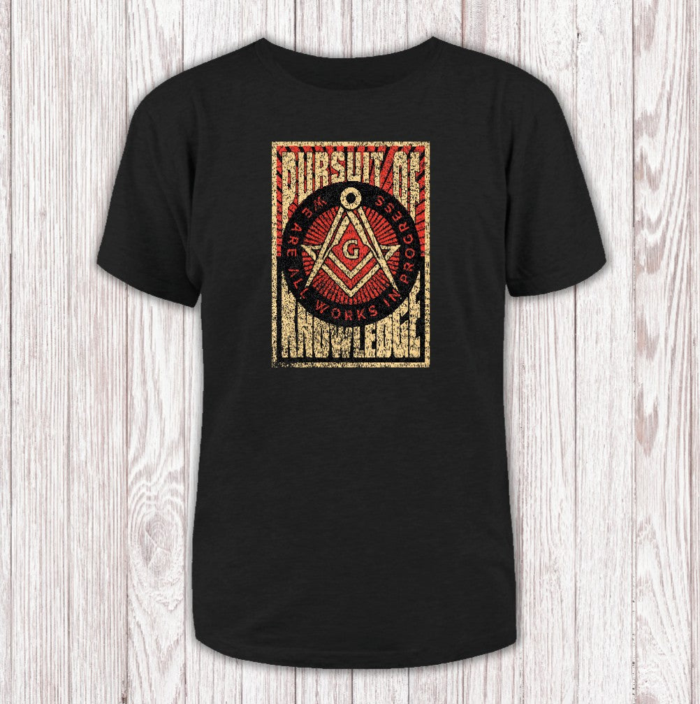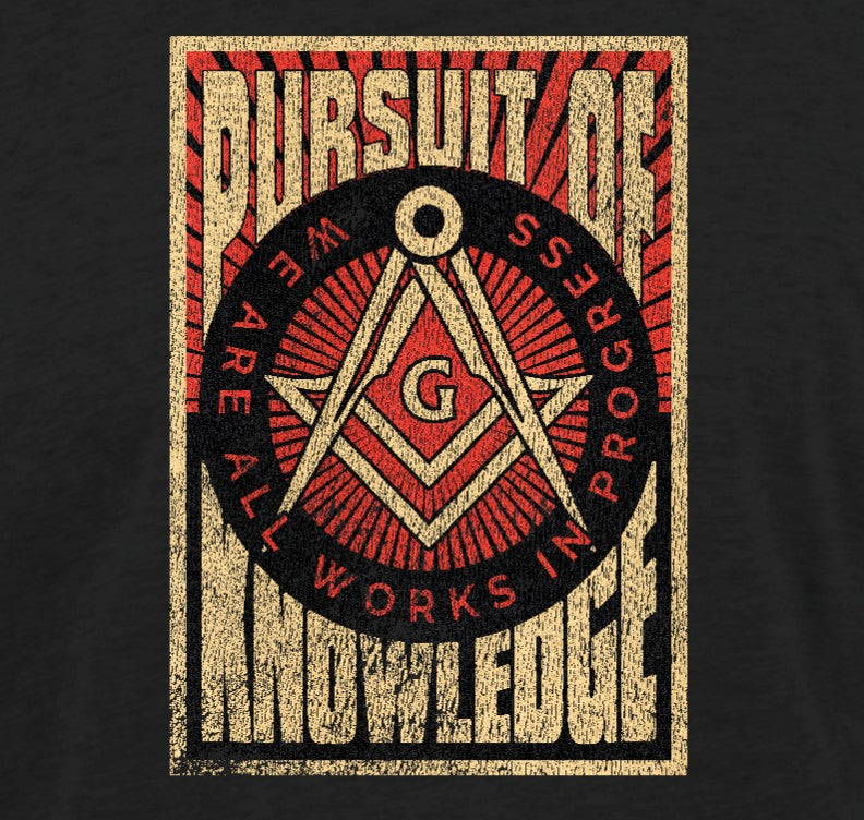 A weathered, textured background sets the stage for bold, thought-provoking words: "We are all works in progress” and “Pursuit of knowledge” The iconic square and compass symbol tie everything back to Freemasonry, creating a design that's sure to spark conversation.